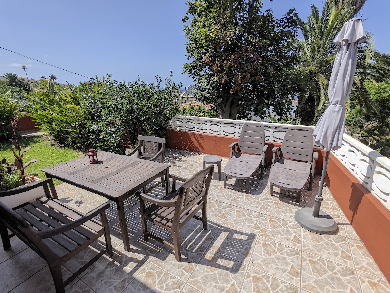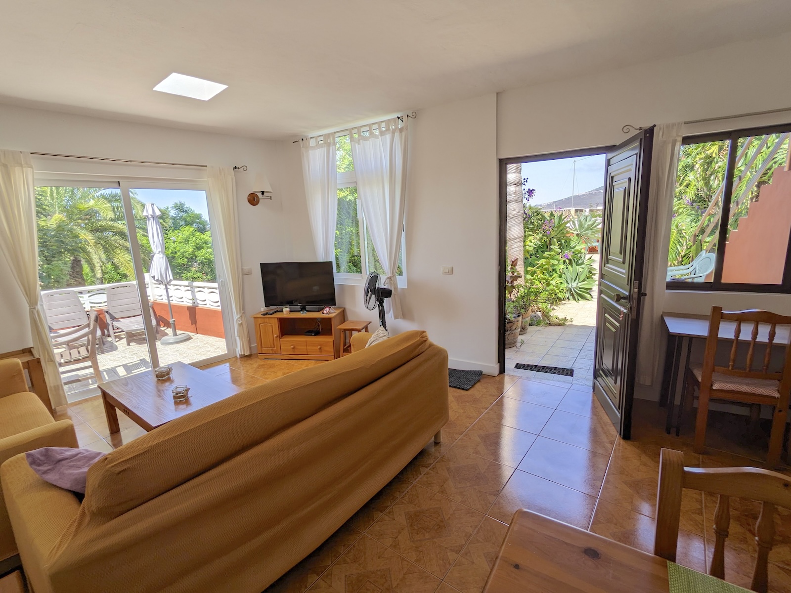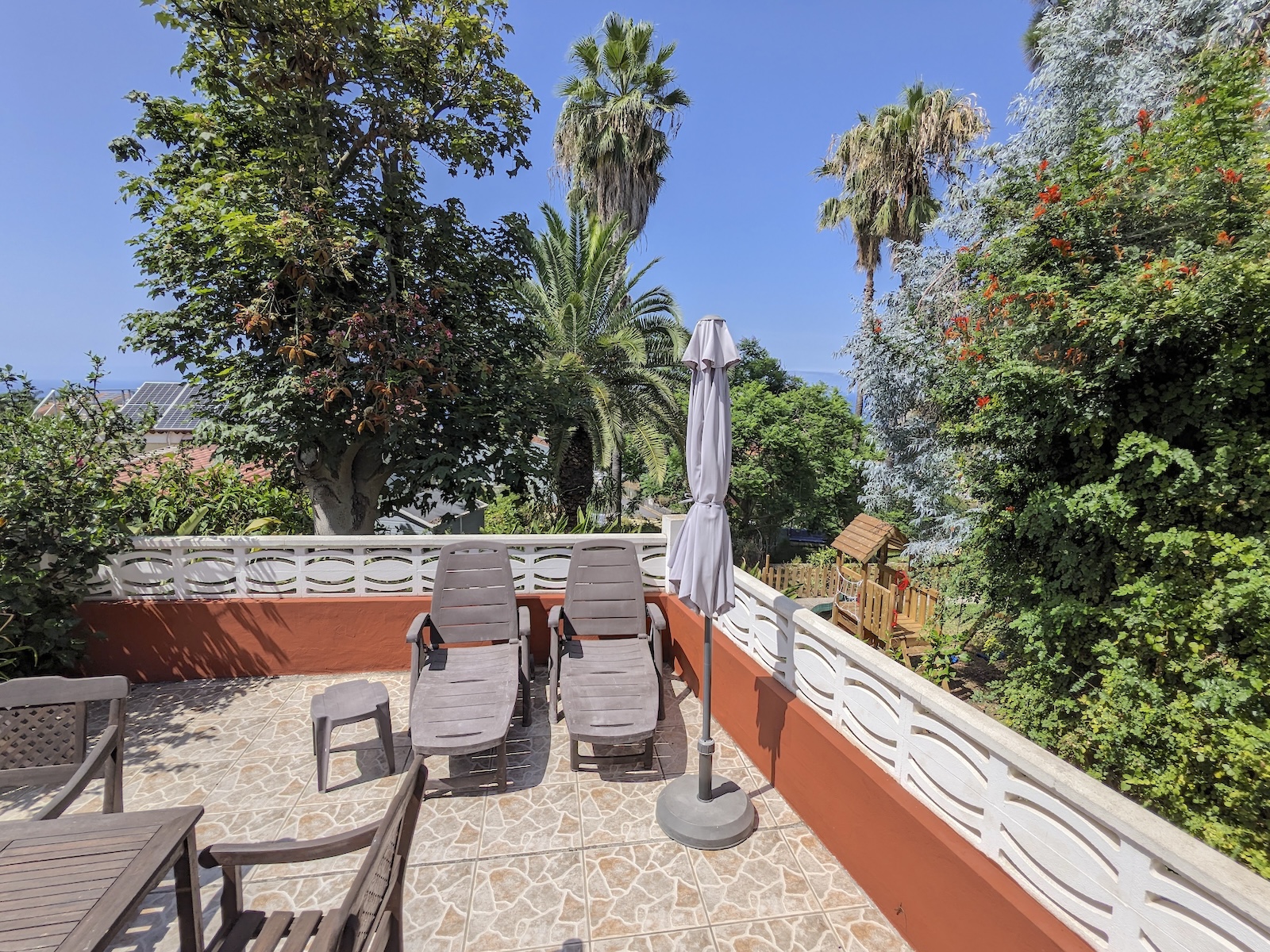 The Casa Luna house is our largest holiday house on the Finca Las Toscas. It offers families or co-living people plenty of space to cook, relax, work and get-together. The house offers an open kitchen (newly installed in 2025) and living area with direct access to the terrace and gardens. The garden has enough space for children to play, do yoga or sun yourself. Casa Luna is located at the beginning of our finca in a dead-end street with lots of privacy. From the garden, the view of the Teide and the Atlantic Ocean is guaranteed. The house is surrounded by gardens, a small playground, and palm trees.